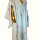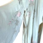 s. Antique silk robe. The palest of green hand embroidered pink and cream flowers. Lined in silk also.