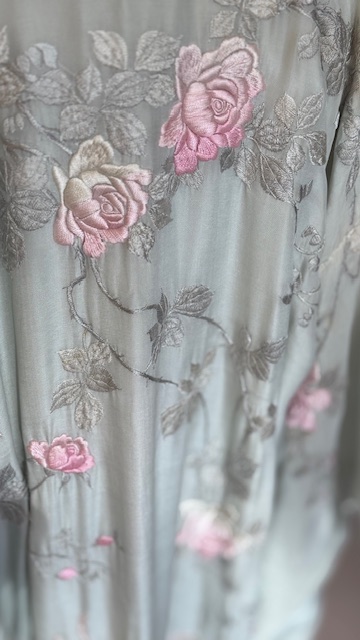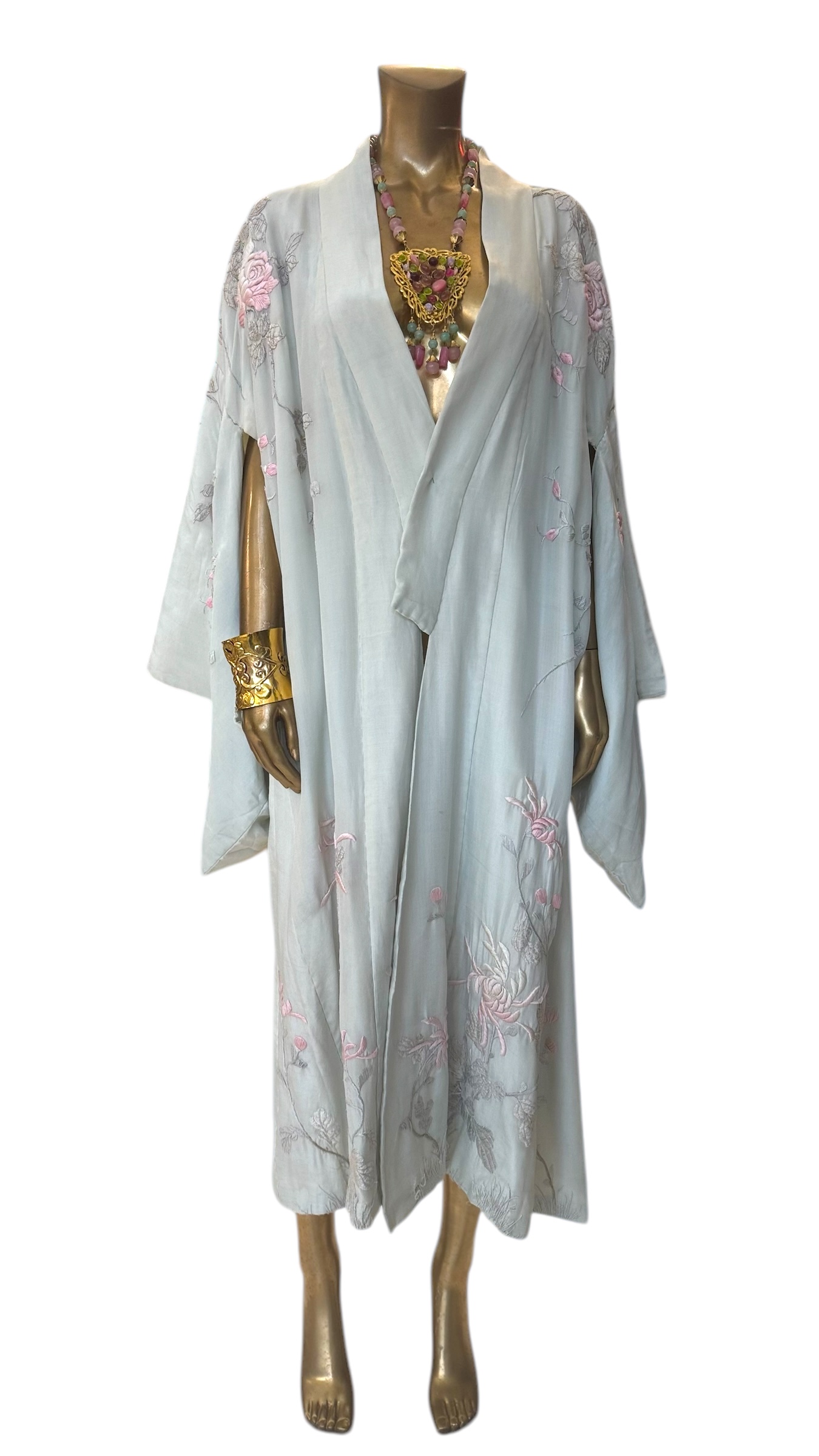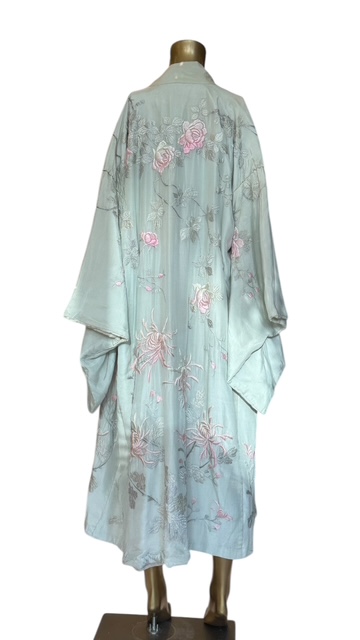 1920s. Antique silk robe. The palest of green hand embroidered pink and cream flowers. Lined in silk also.